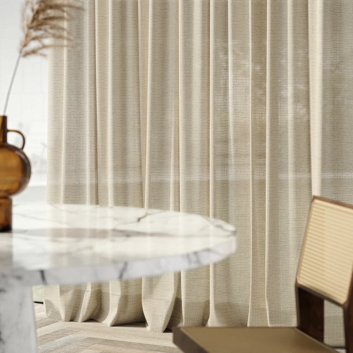 Semifreddo, with its soft pastel colors and unique net structure, adds a relaxed vibe to any room. A blend of 97% polyester and 3% linen, this fabric offers delightful transparency and a casual, light drape.