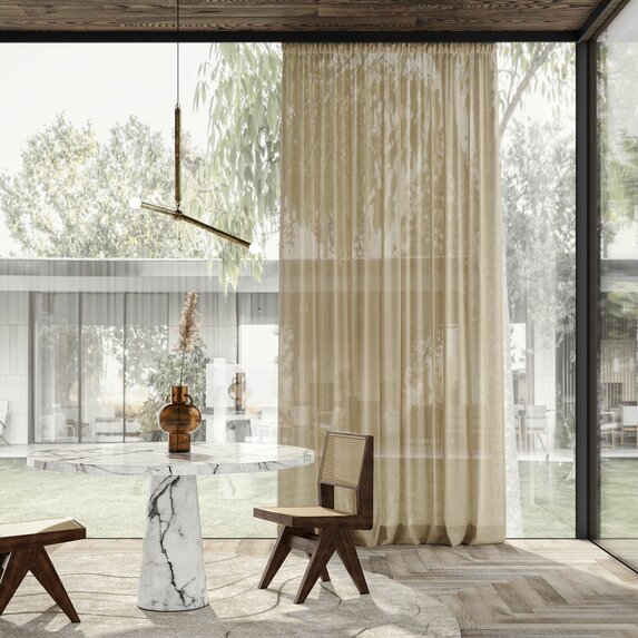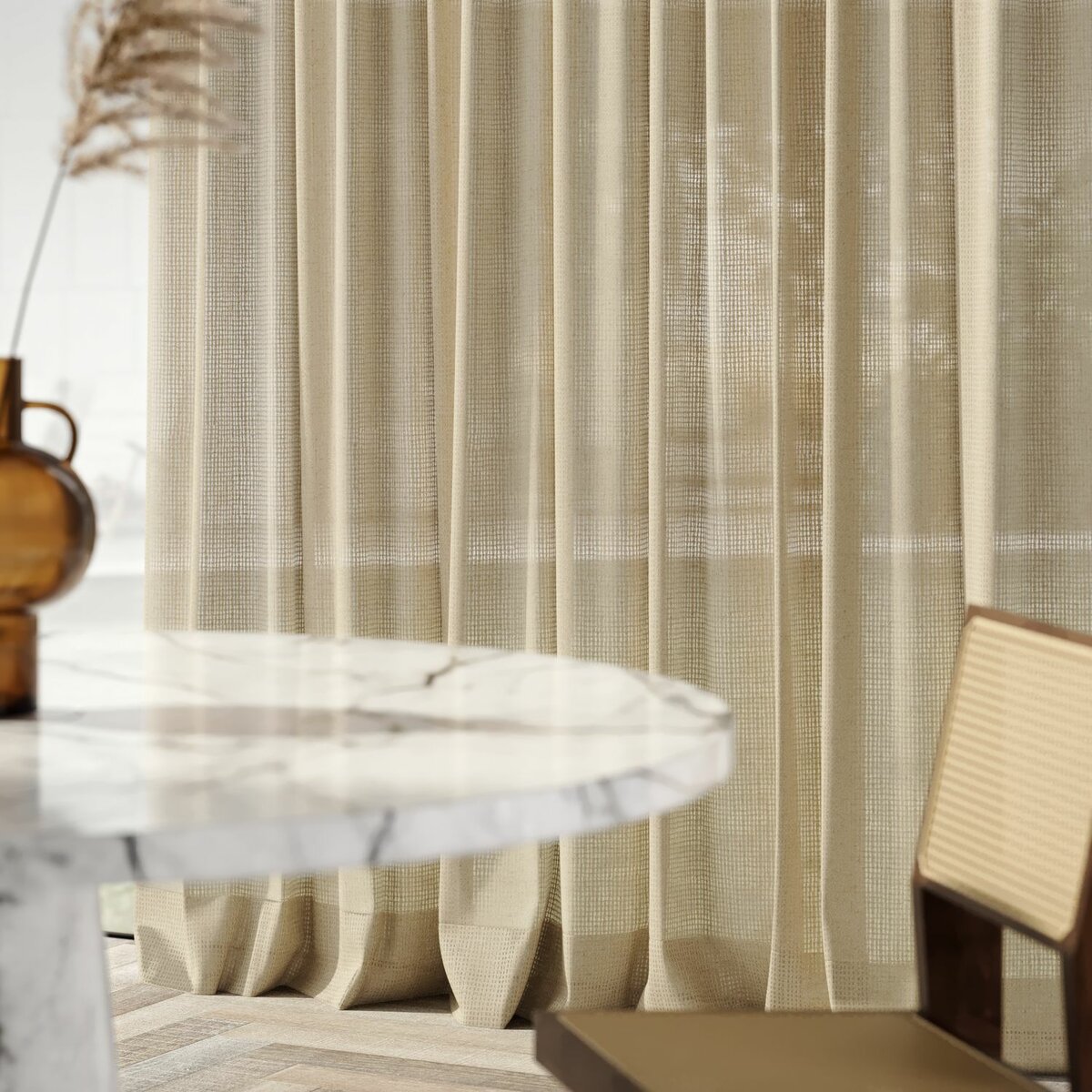 Semifreddo, with its soft pastel colors and unique net structure, adds a relaxed vibe to any room. A blend of 97% polyester and 3% linen, this fabric offers delightful transparency and a casual, light drape.