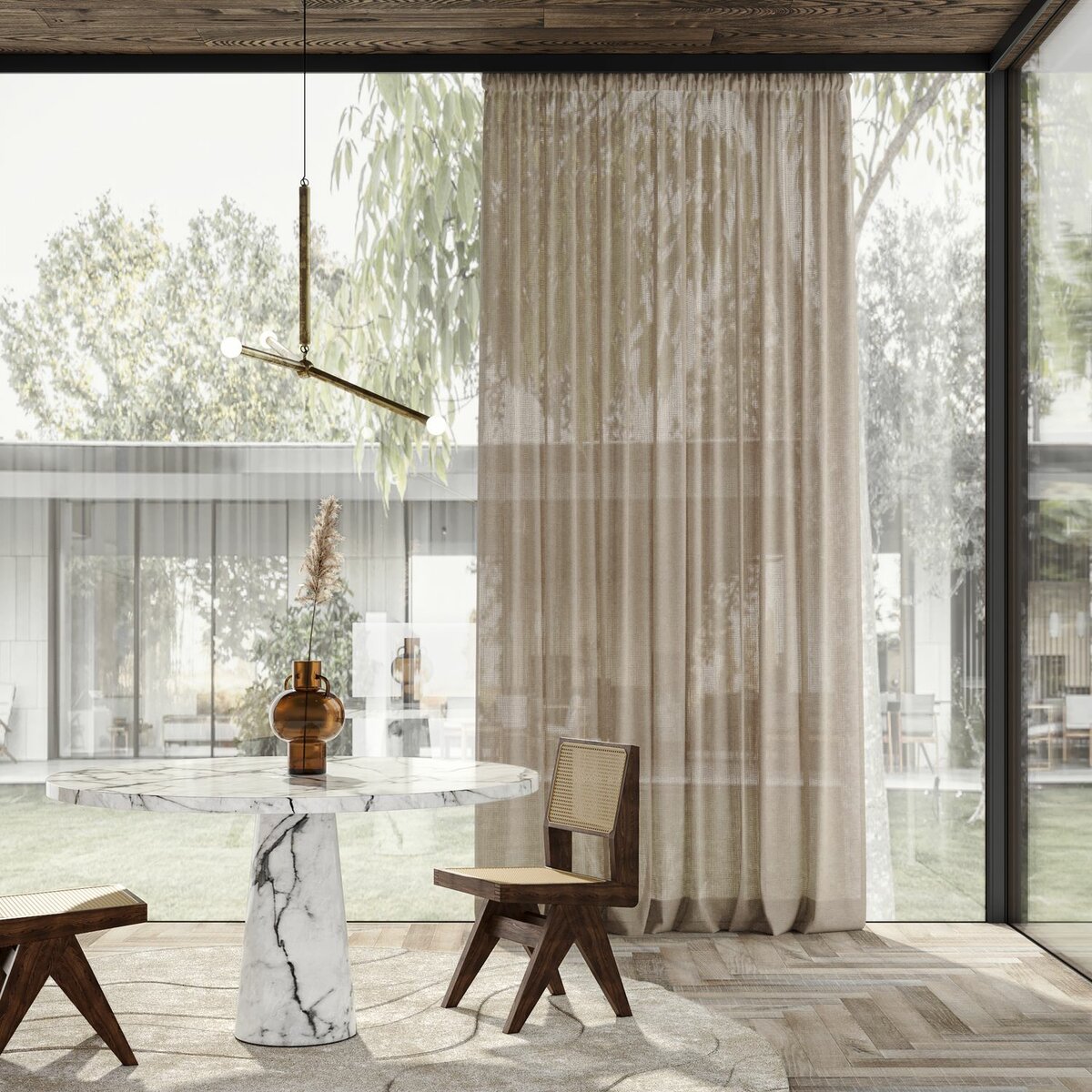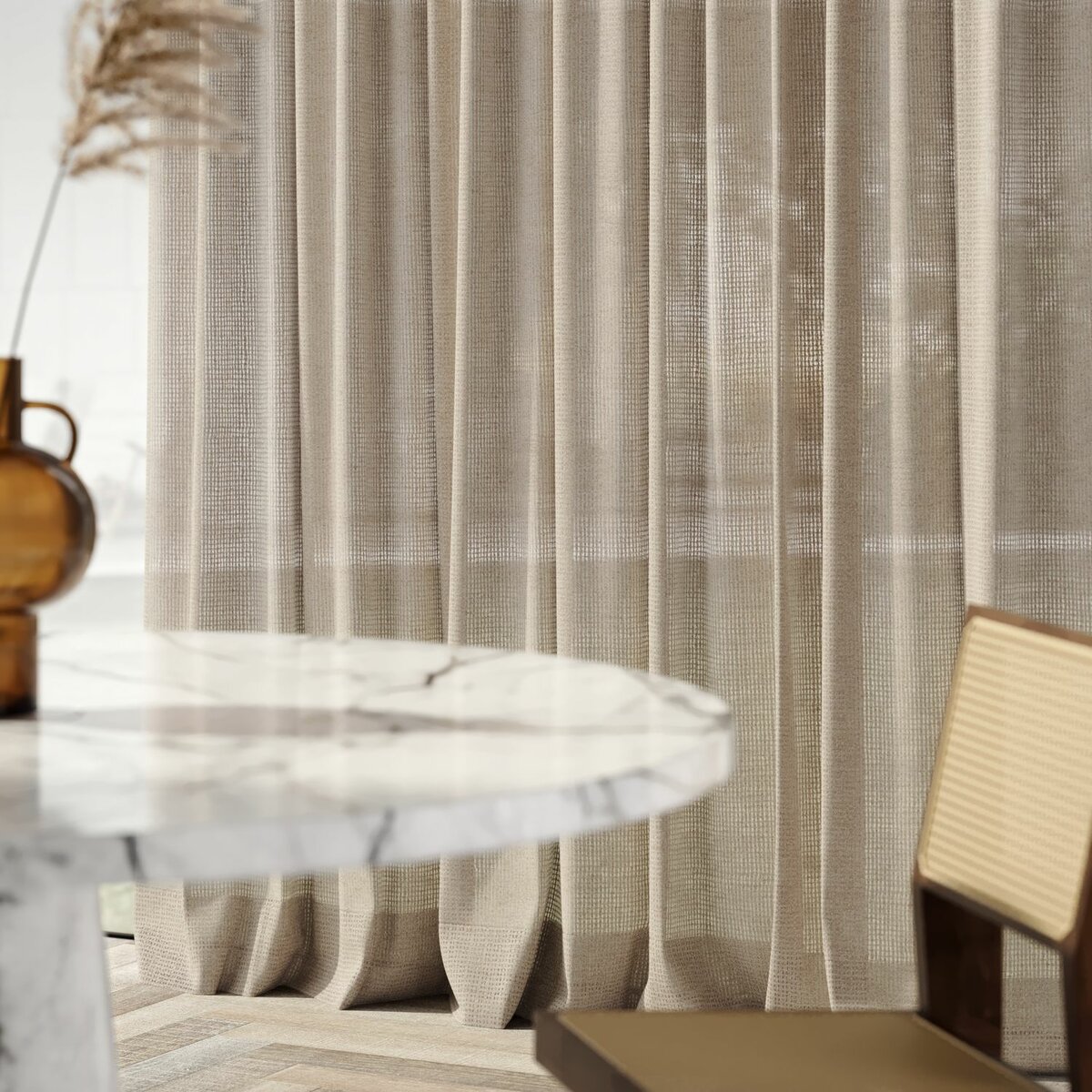 Semifreddo, with its soft pastel colors and unique net structure, adds a relaxed vibe to any room. A blend of 97% polyester and 3% linen, this fabric offers delightful transparency and a casual, light drape.