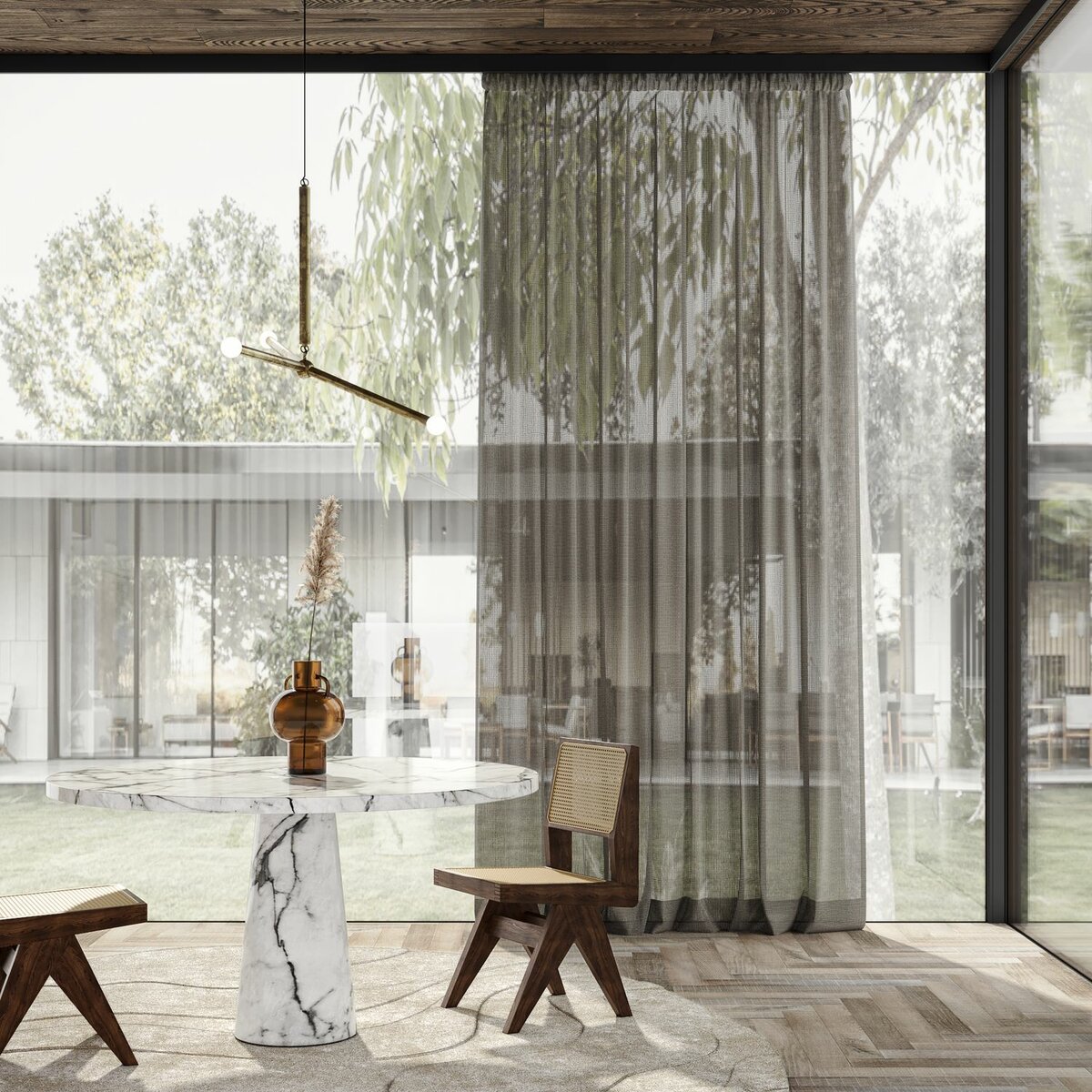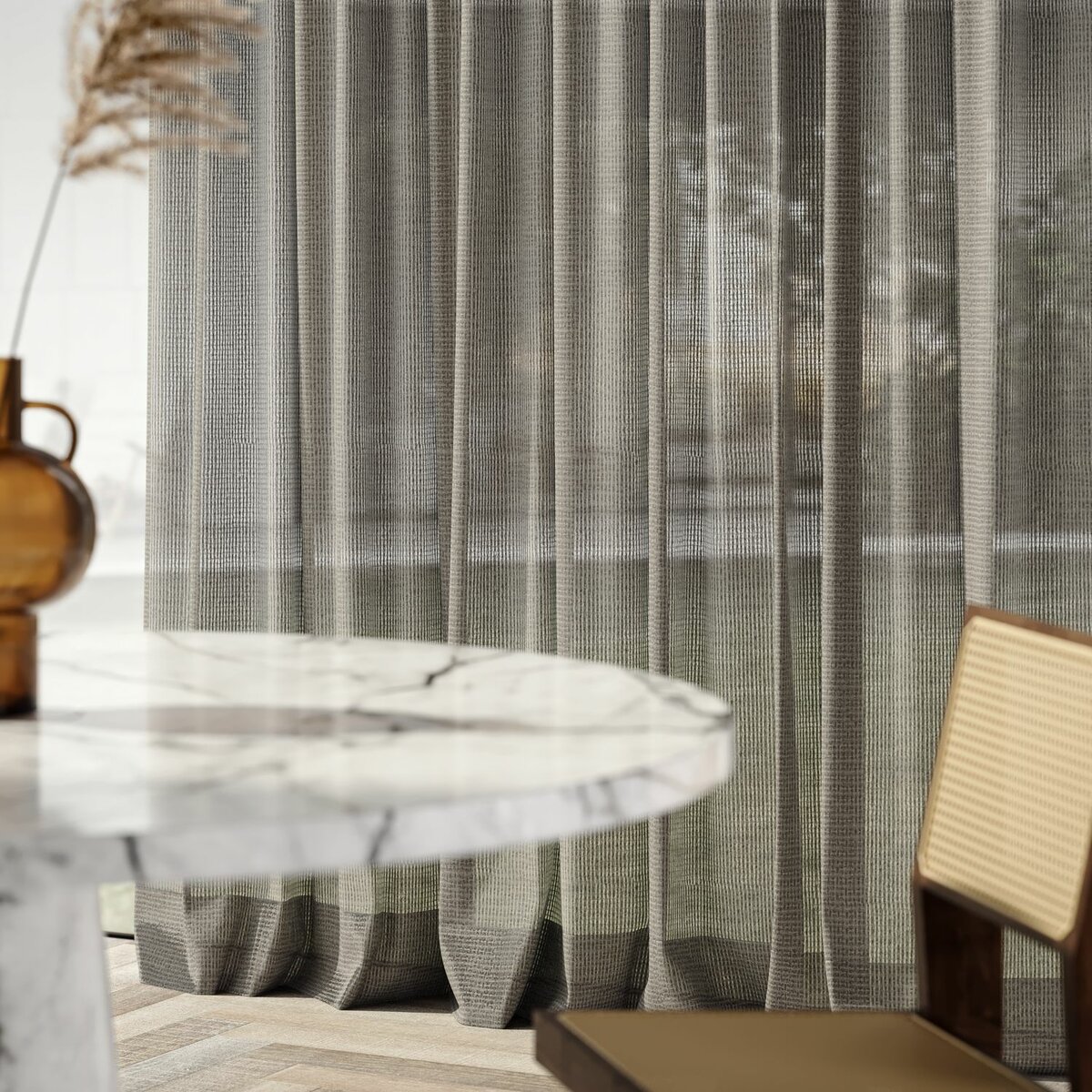 Semifreddo, with its soft pastel colors and unique net structure, adds a relaxed vibe to any room. A blend of 97% polyester and 3% linen, this fabric offers delightful transparency and a casual, light drape.