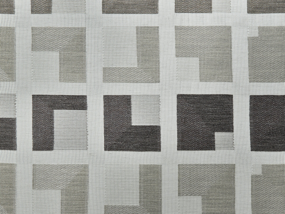 SHADOWPLAY plays with the square motif and its proportions. The thick maze of geometric shapes set against the highly transparent background is graded in different colour shades, underlining the rhythmic sensation created by the pattern. The Scherli technique creates opaque and transparent areas that produce a striking interplay of light and shadow.