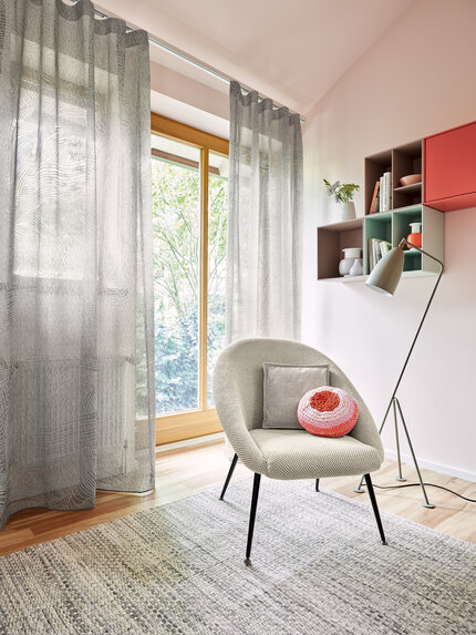 SHANTI has it – your special something! The restrained devoré offers a lot: It shines with naturalness and shows itself relaxed with its delicate spun yarn, intensified by the print that seems to create soft natural stripes just like strié. Its design is characterised by an artistic texture that looks like a large leafy forest - gently flowing, easy to clean and great to decorate.