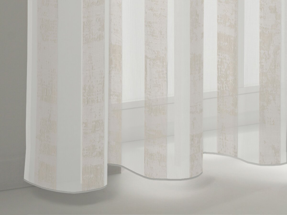 Elegant block stripes given an extra touch of finesse by the interplay between the transparent and the opaque, matt and shiny fibres. The elaborate Jacquard texture creates a varying colour glow in stripes, calling to mind precious patina.