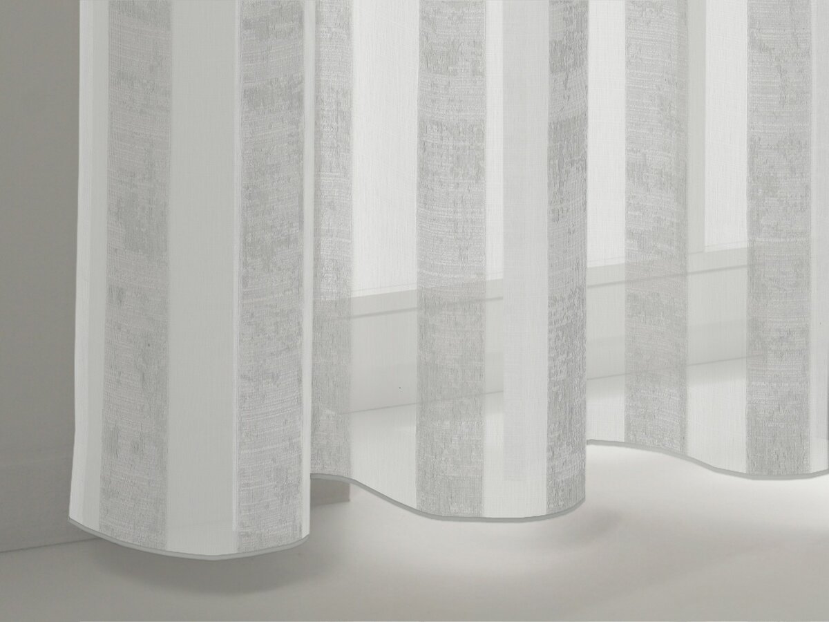 Elegant block stripes given an extra touch of finesse by the interplay between the transparent and the opaque, matt and shiny fibres. The elaborate Jacquard texture creates a varying colour glow in stripes, calling to mind precious patina.