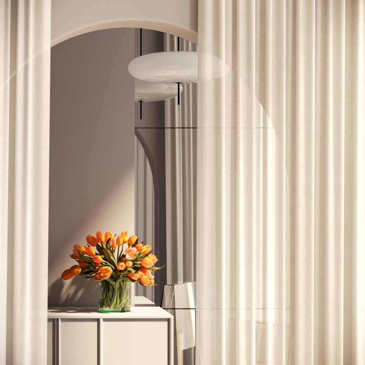 Silky Sorbet, with its transparent, crash-like texture and delicate pastel shades, brings gentle movement and femininity to any room. Made from recycled fibres, it combines sustainability with modern elegance, perfect for relaxed, flowing drapes.