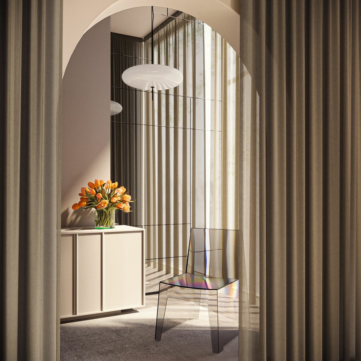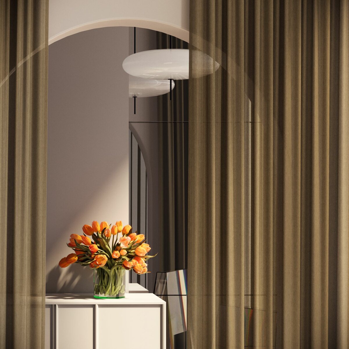 Silky Sorbet, with its transparent, crash-like texture and delicate pastel shades, brings gentle movement and femininity to any room. Made from recycled fibres, it combines sustainability with modern elegance, perfect for relaxed, flowing drapes.