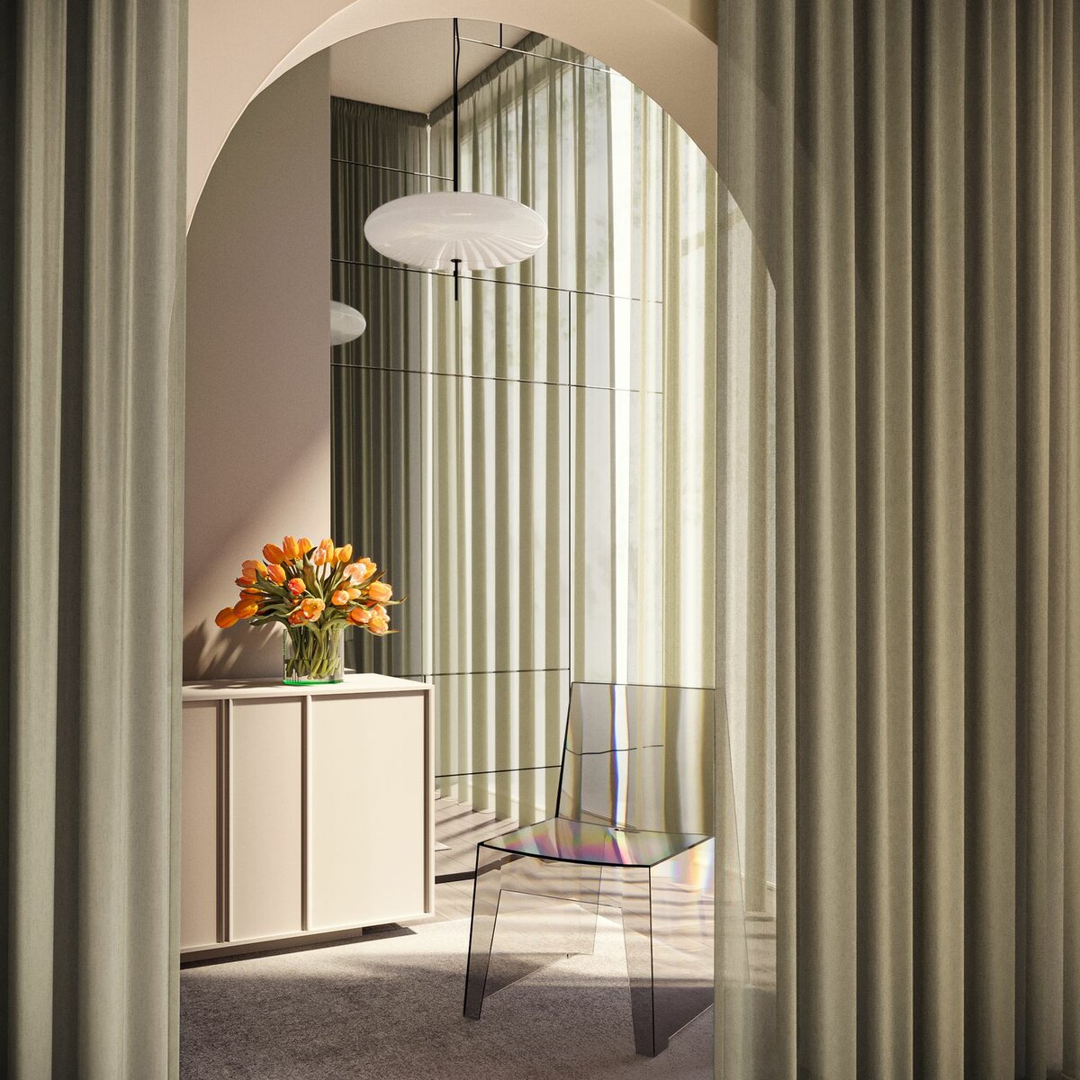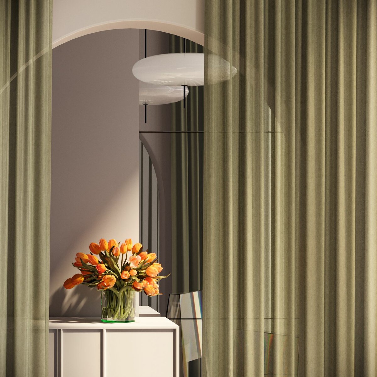 Silky Sorbet, with its transparent, crash-like texture and delicate pastel shades, brings gentle movement and femininity to any room. Made from recycled fibres, it combines sustainability with modern elegance, perfect for relaxed, flowing drapes.