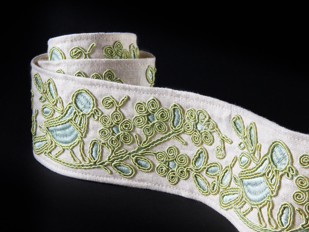 SONGBIRD presents an elegant vignette showing a stylized bird perched atop a leafy branch, surrounded by flowers. It comes to life thanks to a very special detailed cording technique, combined with subtle embroidered accents. Available in five classic colorways, each combination has a twist that adds dimension and depth to this stylish tape.