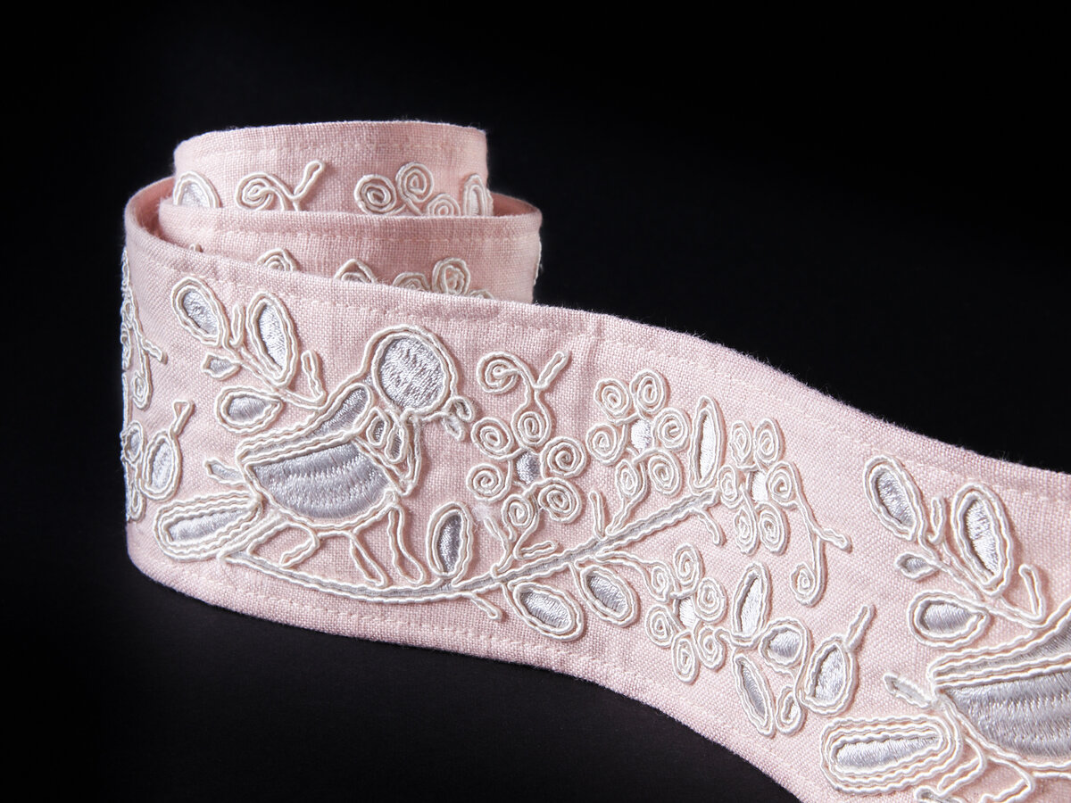 SONGBIRD presents an elegant vignette showing a stylized bird perched atop a leafy branch, surrounded by flowers. It comes to life thanks to a very special detailed cording technique, combined with subtle embroidered accents. Available in five classic colorways, each combination has a twist that adds dimension and depth to this stylish tape.