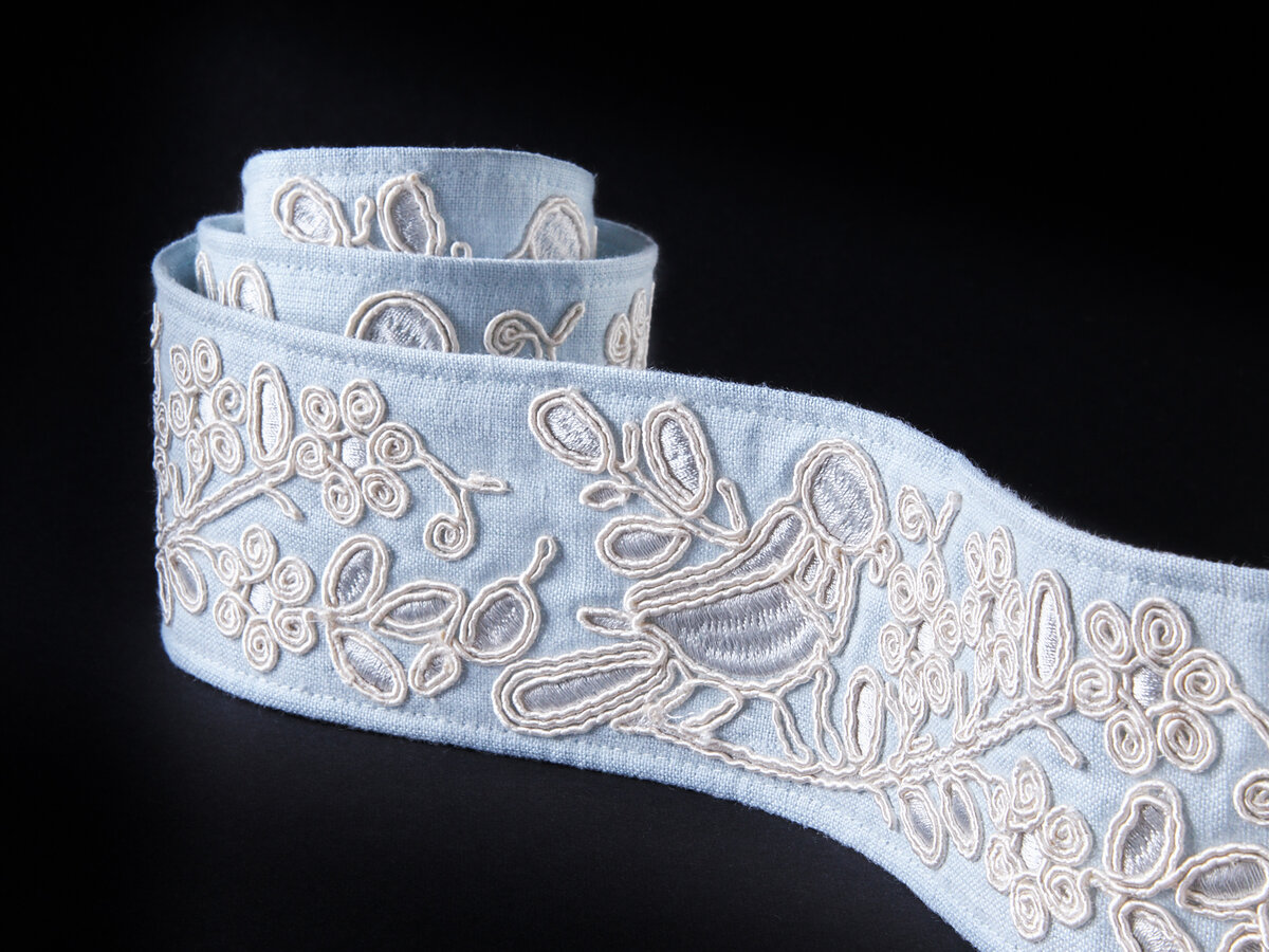 SONGBIRD presents an elegant vignette showing a stylized bird perched atop a leafy branch, surrounded by flowers. It comes to life thanks to a very special detailed cording technique, combined with subtle embroidered accents. Available in five classic colorways, each combination has a twist that adds dimension and depth to this stylish tape.