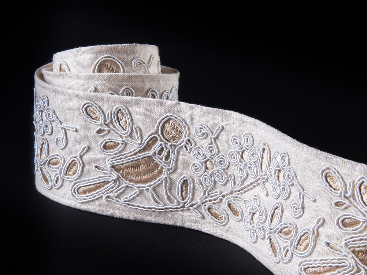 SONGBIRD presents an elegant vignette showing a stylized bird perched atop a leafy branch, surrounded by flowers. It comes to life thanks to a very special detailed cording technique, combined with subtle embroidered accents. Available in five classic colorways, each combination has a twist that adds dimension and depth to this stylish tape.