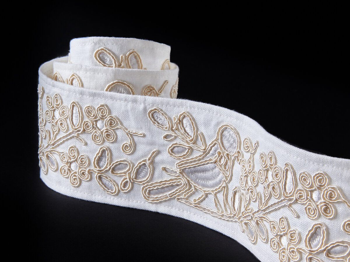 SONGBIRD presents an elegant vignette showing a stylized bird perched atop a leafy branch, surrounded by flowers. It comes to life thanks to a very special detailed cording technique, combined with subtle embroidered accents. Available in five classic colorways, each combination has a twist that adds dimension and depth to this stylish tape.