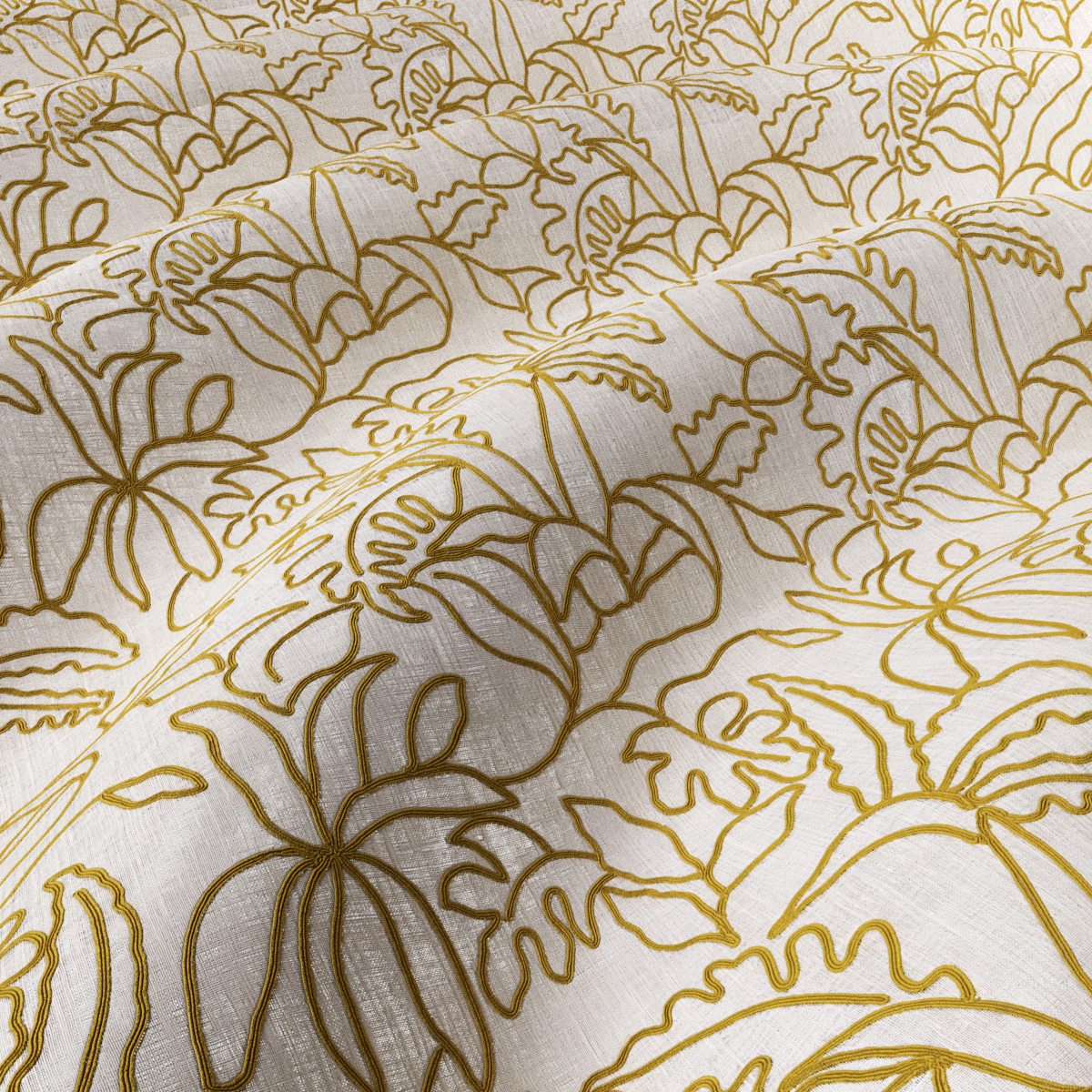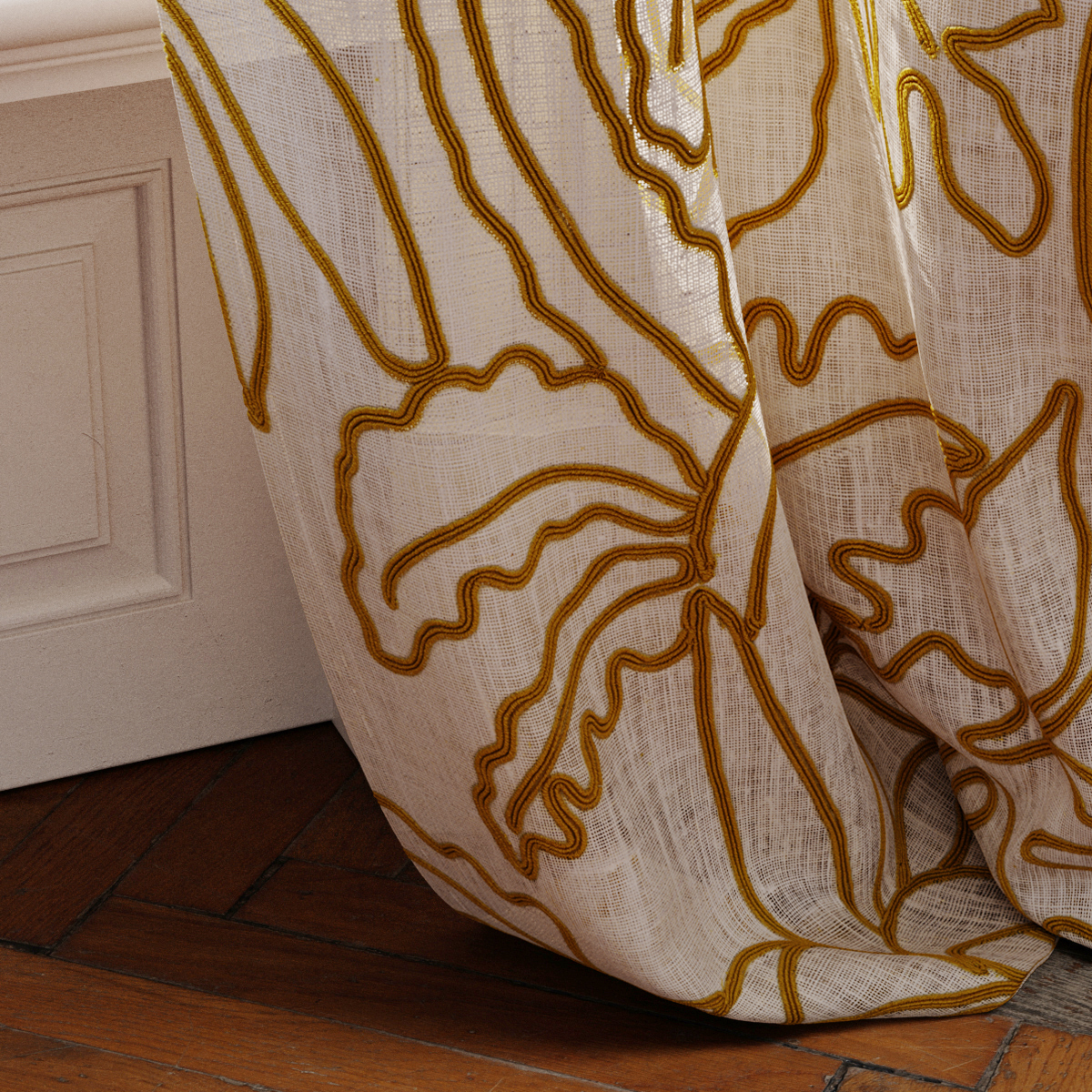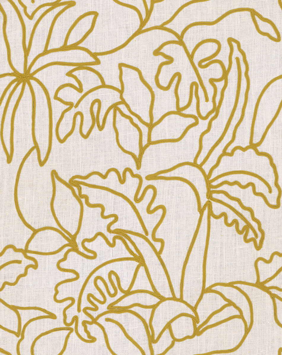 Sublime Cornely embroidery boldly evokes the delicate dance of colored foliage – all in relief and with an interplay of materials – on a heavy linen base.