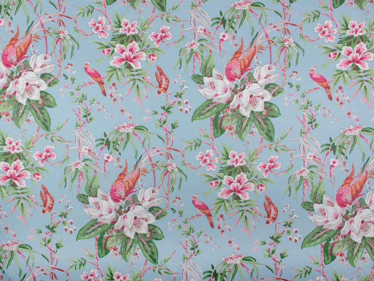Adapted from an antique screen-printed design, St. Croix is a tropical bird and floral print on a beautiful cotton satin ground cloth. Available in four vibrant colourways, St. Croix is a dramatic statement print that can make a room.
