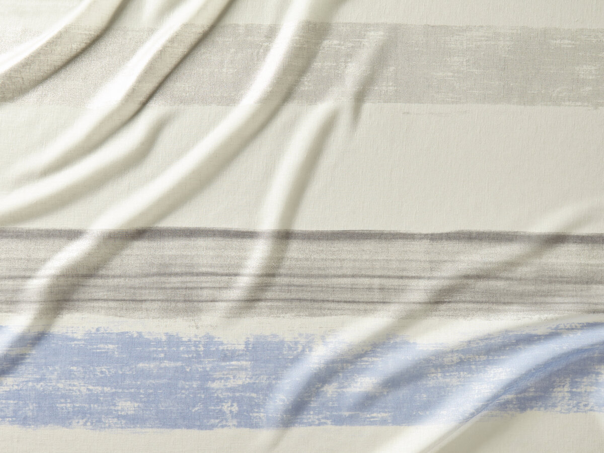 Sunny colours and horizontal stripes with a metallic effect conjure up that holiday feeling at your window. Its light, airy quality evokes an abstract landscape painting that affords a sweeping view of the distant horizon.