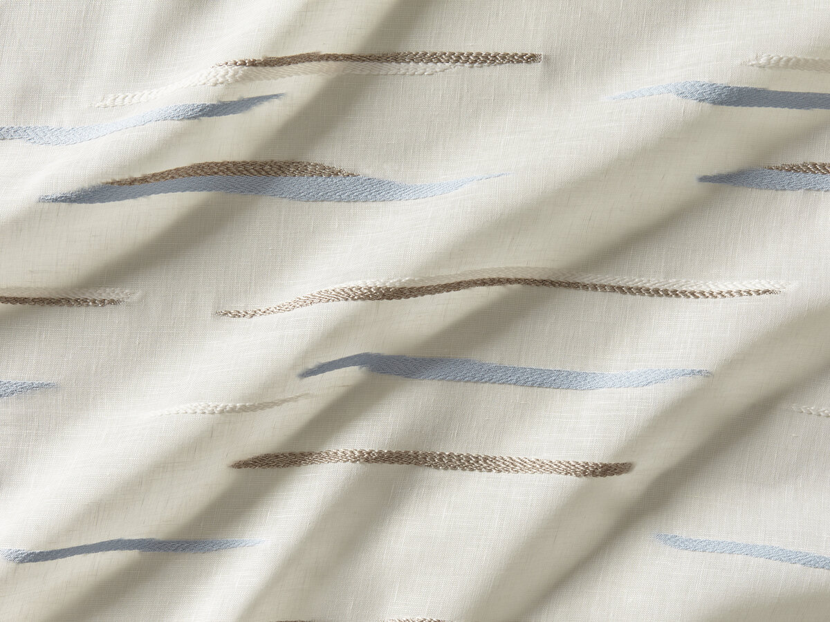This design captivatingly replicates the reflection of light on the surface of water. This semi-transparent fabric gets its vibrancy from the interplay between matte and shiny threads and the range of different colours set against a subdued linen background.