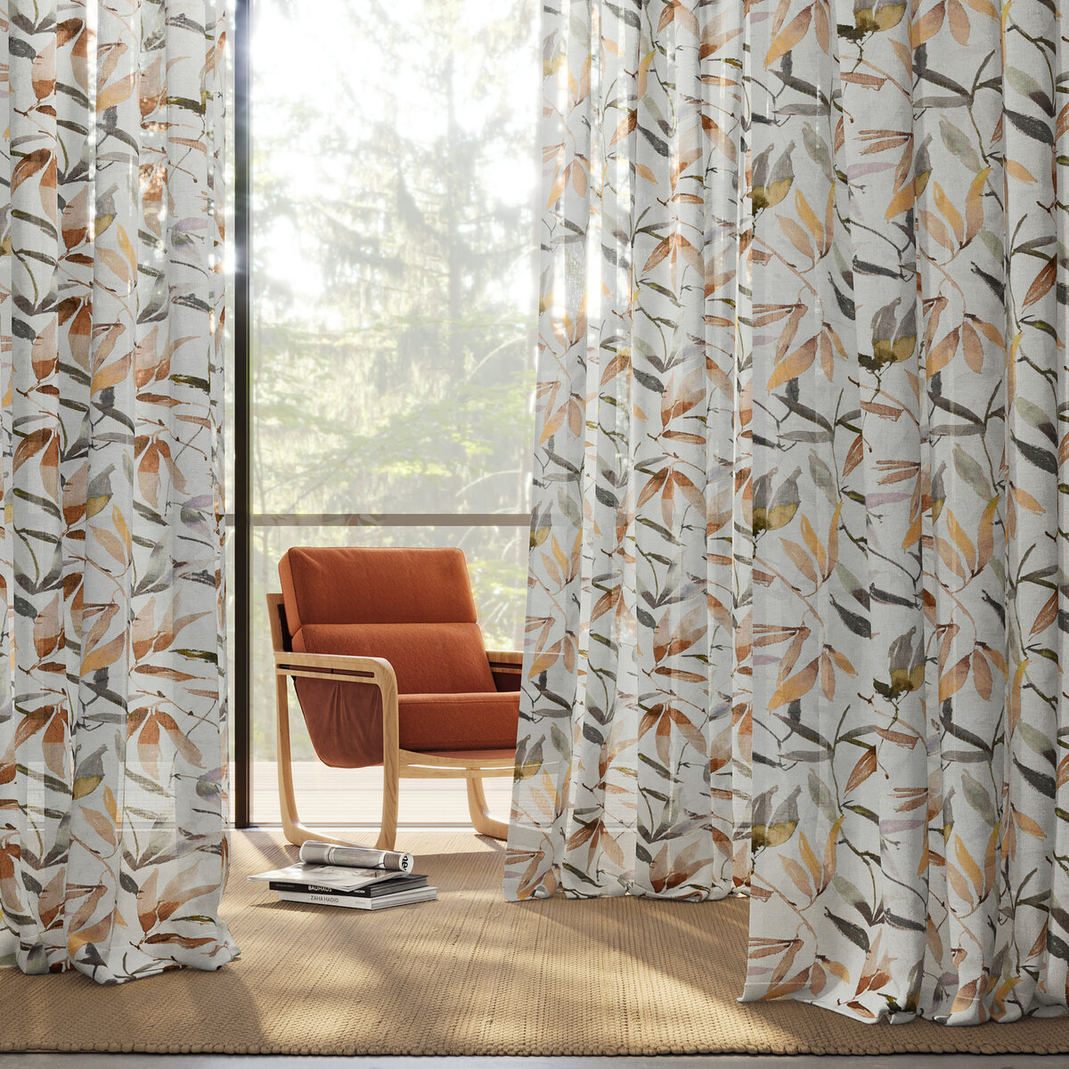 This poetic print rests on a high-quality, easy-care 2510 POEM FR RE base made from 100% recycled fibres and is permanently flame-retardant. With optional weighting tape, it drapes as elegantly as a leaf in the wind.