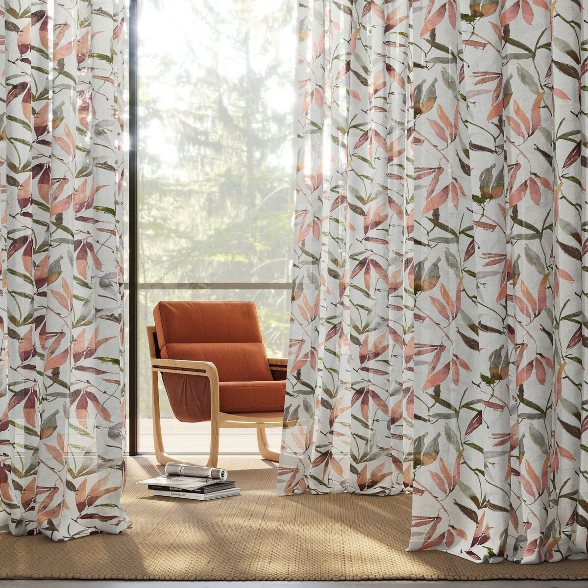 This poetic print rests on a high-quality, easy-care 2510 POEM FR RE base made from 100% recycled fibres and is permanently flame-retardant. With optional weighting tape, it drapes as elegantly as a leaf in the wind.