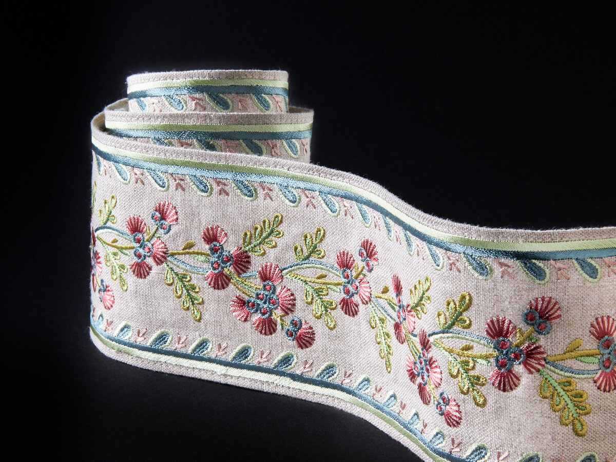 Stylized flowers and leaves climb up TERRACE VINE, embroidered using very fine detailed stitches that come together for a refined effect. The tape is complete with a border at both edges and is available in five colorways. This floral tape is the perfect way to add a feminine touch to any interior.