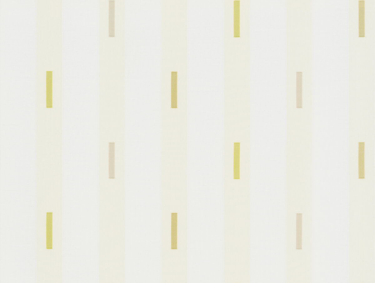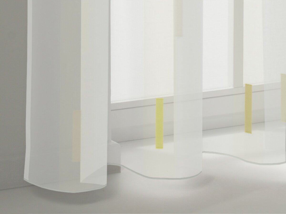 An attractive variation on the theme of stripes: sections of Scherli in six colour tones are arranged at intervals along vertical paths on a two-tone transparent background. The piece is rounded off with delicate accents in chenille.