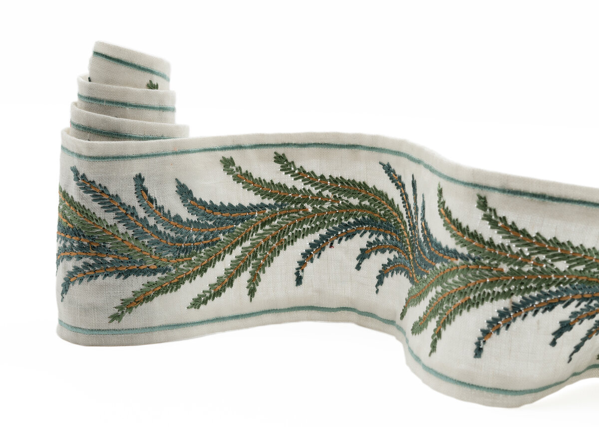 A delicate embroidery referencing 19th century botanical illustration, Trailing Fern is a sophisticated and elegant design that flows gently up the tape. Embroidered on a linen ground, the combination of pretty stitches and fresh colours create a beautiful design representative of new beginnings: perfect for a fresh interior space.