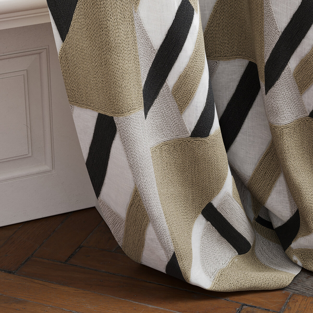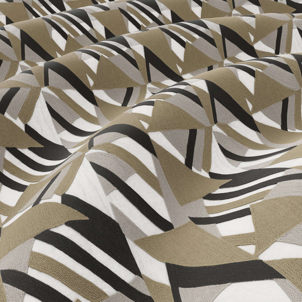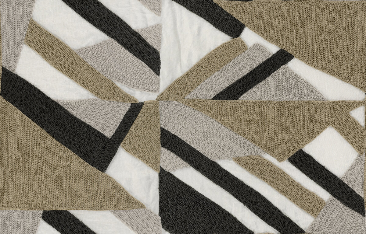Inspired by the abstract art of Constructivism, diagonal striped motifs and triangular surfaces combine to create a captivating geometric all-over design. The hand-sewn motifs add a relief effect with their slightly raised texture on the linen base.