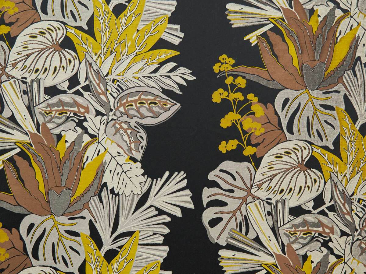 TROPICAL celebrates the lavish shapes and forms of vegetation found in the tropics. Produced as an elaborate Jacquard weave on an ultra-fine silk-like warp, decorative leaf and flower shapes intertwine on the elegant satin background. After the fabric has been woven, a soft brush finish is applied, giving it a modern, gently flowing look and striking patina.