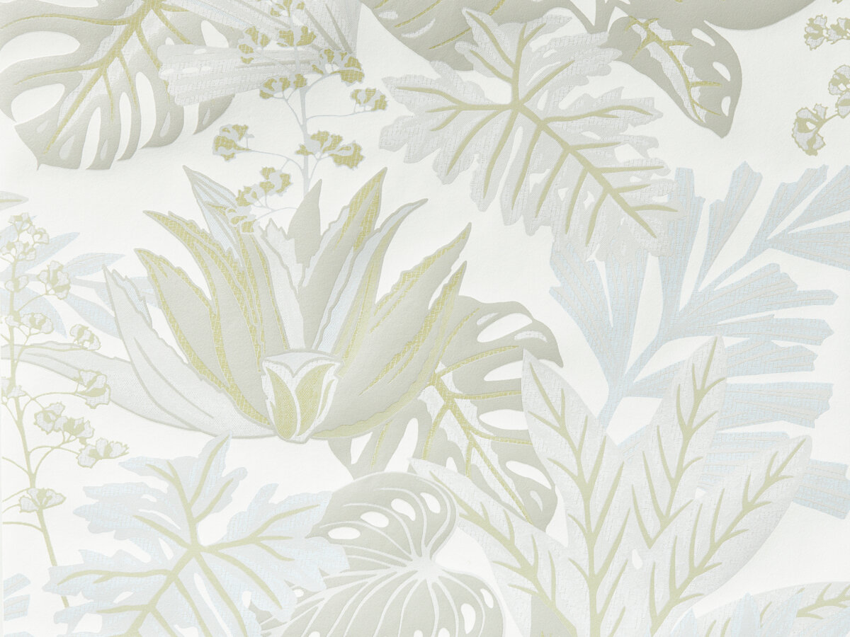 With TROPICAL WALL, the name says it all. A rich tapestry of agave, monstera, and fern leaves are seen across the entire surface, drawing your gaze into an exotic world. TROPICAL WALL has delicate, subtle structures on the surface of the material which, in combination with its soft, abstract tones, lend it its modern look. Produced as a two-dimensional rotary print with gentle accents and contrasts, this design skilfully blends into the room as an emotional highlight.
