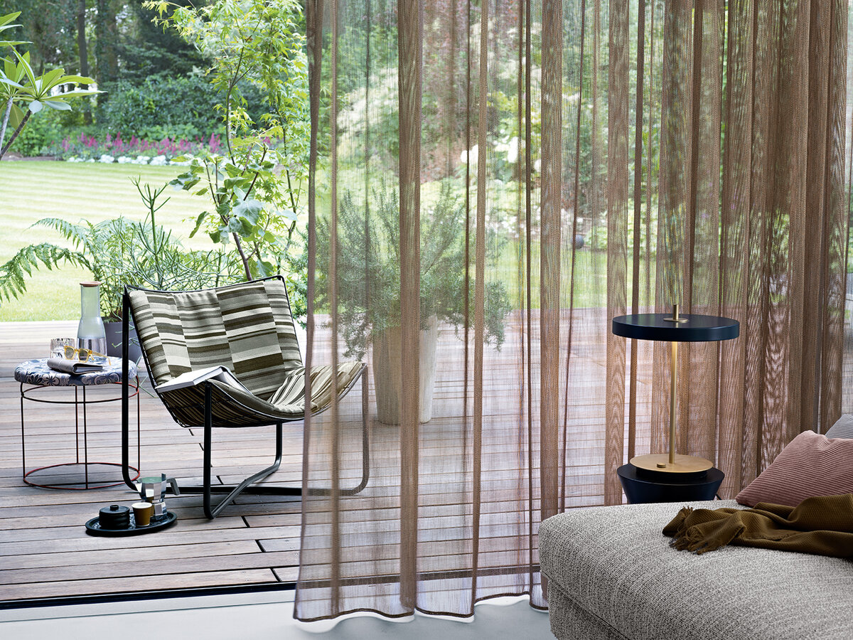 A closely twisted yarn forms the basis of this semi-transparent, flame-retardant fabric. A direct dyeing process means that only one component of the yarn takes on the colour, while the second yarn keeps its original colour. This results in interesting contrasts, which create their special effect in particular with the stronger tones of TWINE FR.