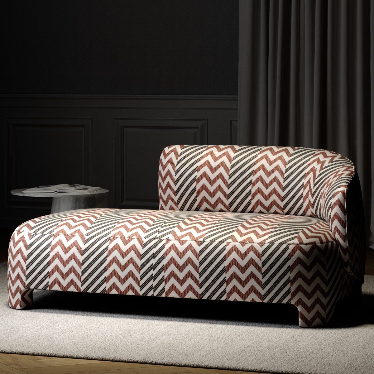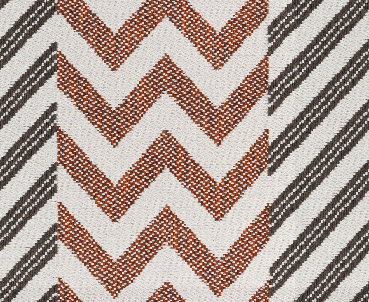 A modernist chevron, VALBONNE plays with color and boasts large vertical stripes. Reinterpreted in jacquard, it is interwoven with elegant, near-natural structured yarn.