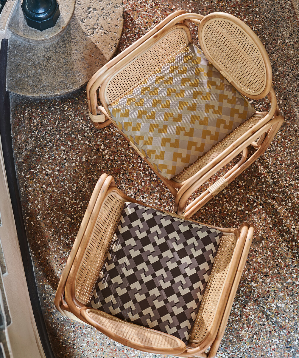This graphic jacquard pattern fascinates with its sophisticated and vibrant color combinations. The use of high-quality mercerized cotton in the weft and the special weave effects give VASARI its fine sheen and dimensional surface structure. The seven beautiful colorways of this all-over design can be used both as an upholstery and as a decorative fabric and integrated into any elegant room concept.