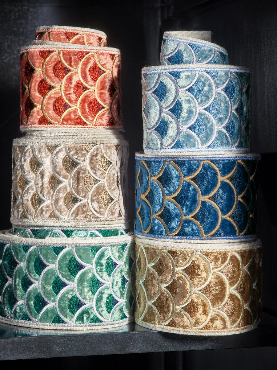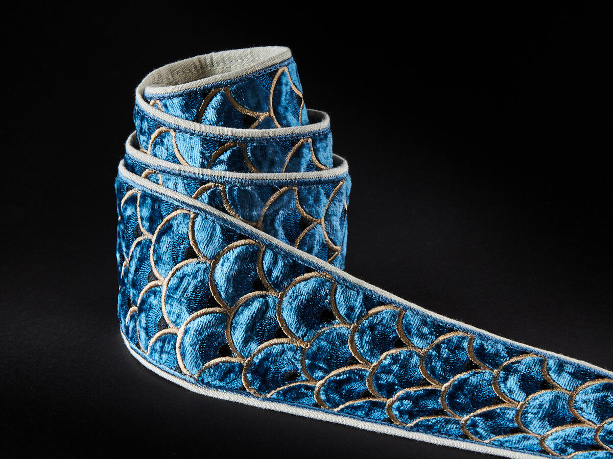 VIONNET is an intricate fish scale design that plays with light and shadow, mixing velvet with 3 shades of embroidery. It is named for Madeleine Vionnet, one of the most influential fashion designers of the 20th century, known for her precise construction of garments. Like Vionnet’s creations, this tape radiates elegance. Its subtly embroidered ombre detail and accent outline colour add depth to the tape, which is available in six stunning colorations. This tape is an Art Deco masterpiece.