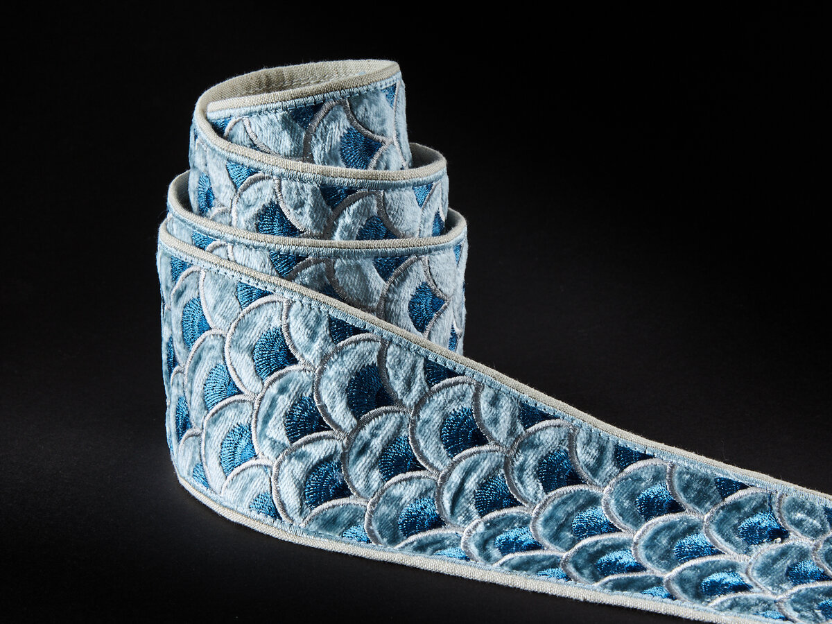VIONNET is an intricate fish scale design that plays with light and shadow, mixing velvet with 3 shades of embroidery. It is named for Madeleine Vionnet, one of the most influential fashion designers of the 20th century, known for her precise construction of garments. Like Vionnet’s creations, this tape radiates elegance. Its subtly embroidered ombre detail and accent outline colour add depth to the tape, which is available in six stunning colorations. This tape is an Art Deco masterpiece.