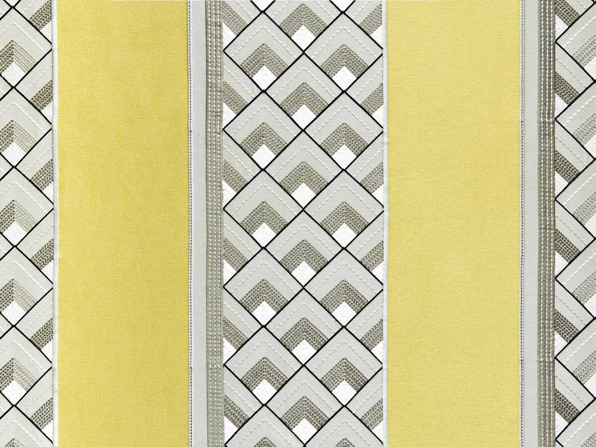 VISIONE drew its inspiration from the architecture of the Golden Twenties. The handstitched embroidery of this regal striped pattern combined with subtle tones and three-dimensional relief is simply captivating. The elegant, iridescent effect of the jacquard background rounds off the sophistication and modernity of this refined fabric.