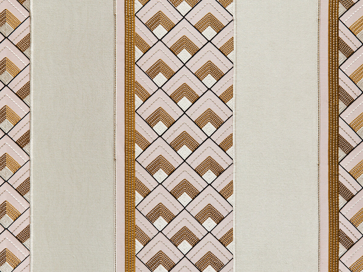 VISIONE drew its inspiration from the architecture of the Golden Twenties. The handstitched embroidery of this regal striped pattern combined with subtle tones and three-dimensional relief is simply captivating. The elegant, iridescent effect of the jacquard background rounds off the sophistication and modernity of this refined fabric.