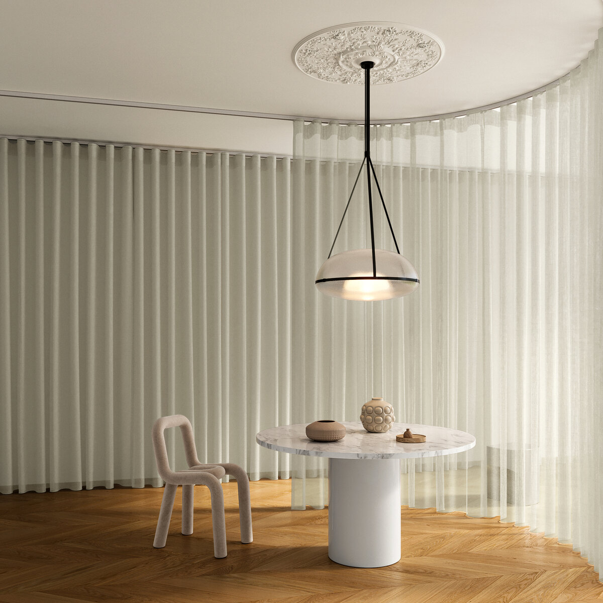 VITRUV is architecture in fabric. Clear in form, function, and focus, its architectural look in a choice of 10 trendy colors will make a statement in any interior, whether at home, in the office or in a hotel. Outstanding: VITRUV can also be transformed into an iconic room divider in multiple layers and colors. In this context, the transparent, flame-retardant mesh fabric made from recycled polyester showcases its functional aesthetic. Why not try this fabric in your own home?