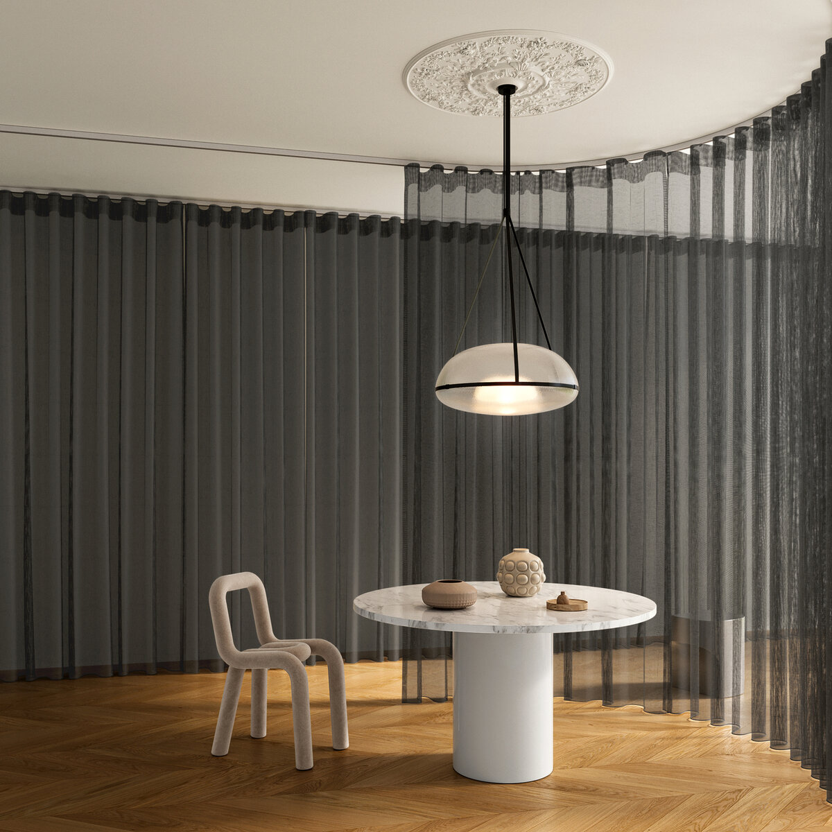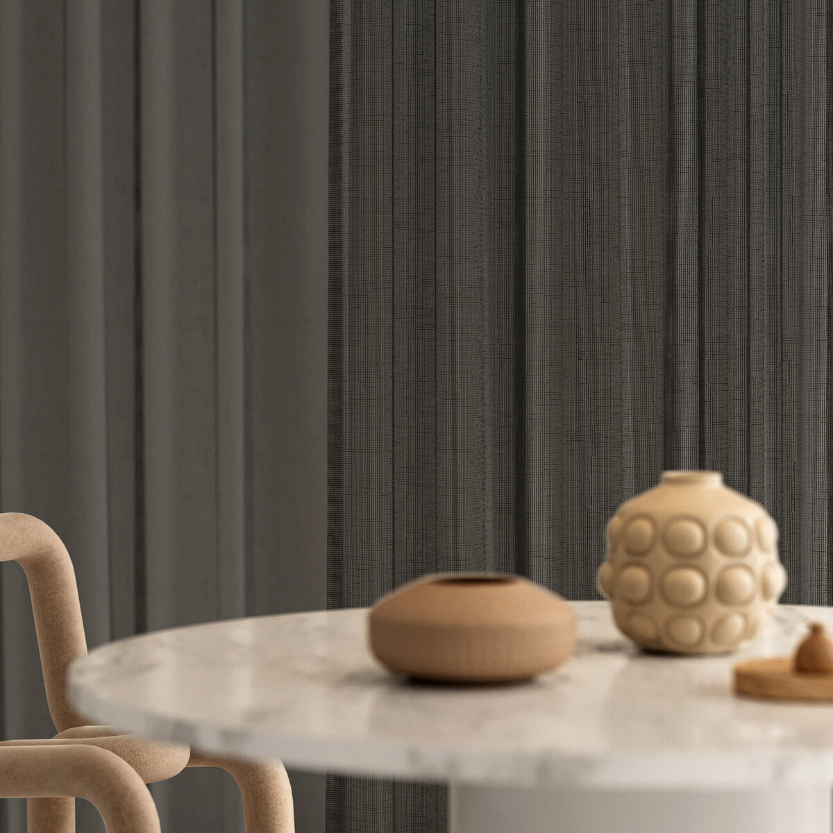 VITRUV is architecture in fabric. Clear in form, function, and focus, its architectural look in a choice of 10 trendy colors will make a statement in any interior, whether at home, in the office or in a hotel. Outstanding: VITRUV can also be transformed into an iconic room divider in multiple layers and colors. In this context, the transparent, flame-retardant mesh fabric made from recycled polyester showcases its functional aesthetic. Why not try this fabric in your own home?