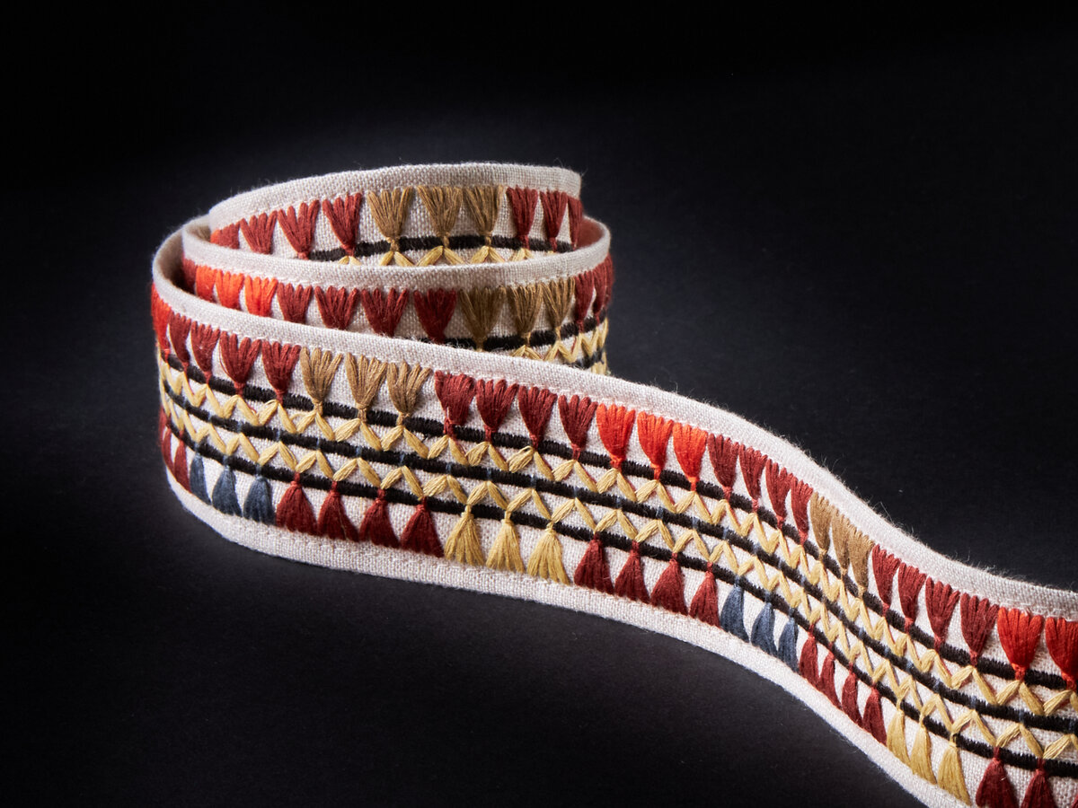 WILDER TAPE is named for American horticultural writer and designer Louise Beebe Wilder, whose 1918 book ‘Color in my Garden’ inspired this collection’s palette. Rustic in design, this multicolored tape is machine embroidered with dry spun yarns to emulate a hand embroidered look. Available in four colorways, each one offers a palette range that makes it a perfect bridge to any room.