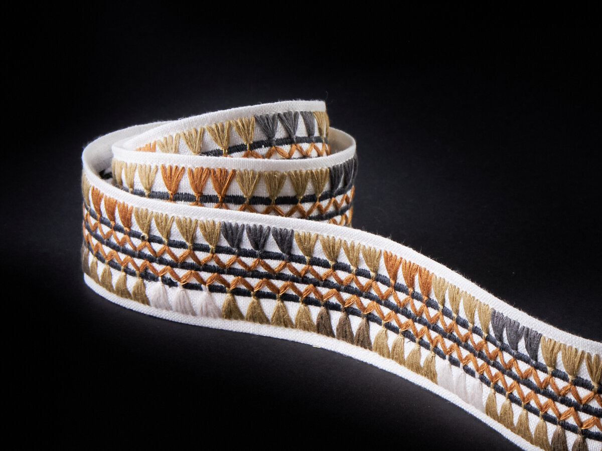WILDER TAPE is named for American horticultural writer and designer Louise Beebe Wilder, whose 1918 book ‘Color in my Garden’ inspired this collection’s palette. Rustic in design, this multicolored tape is machine embroidered with dry spun yarns to emulate a hand embroidered look. Available in four colorways, each one offers a palette range that makes it a perfect bridge to any room.