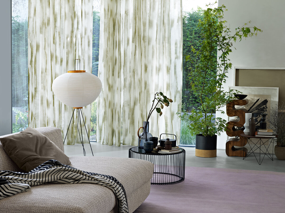 The design of the digital print WIND GUST is based on the centuries-old Japanese dyeing art of Shibori. Delicate gradients and overlays provide tension and depth. WIND GUST is printed on a light double weave with structured decorative yarns floating loosely in the centre. Gentle movements are created that play harmoniously with the design by partially fixing the layers of the fabric.
