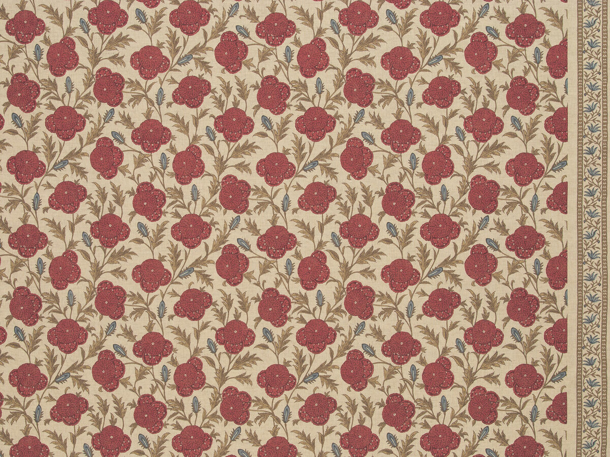 This pleasing indian floral vine print is enhanced by a boarder engineered to be removed and reapplied as a decorative finish according to the designer's discretion. Printed on a cotton/linen ground, WINTON FLORAL has the distressed look and character of the original print document.