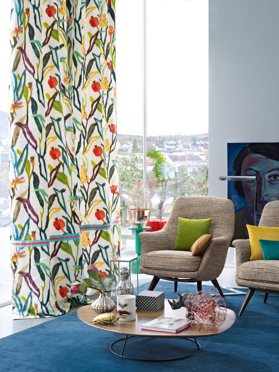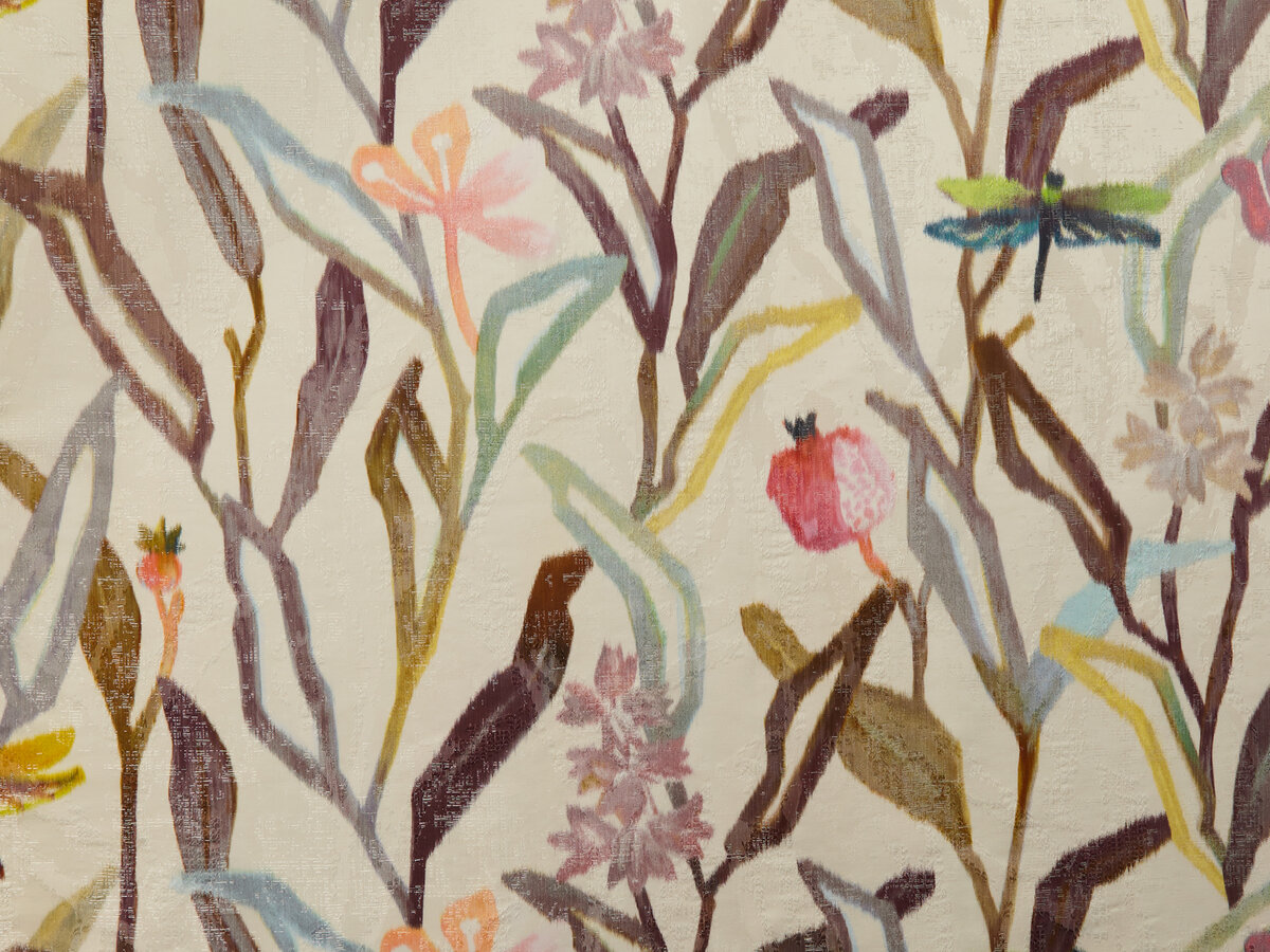 Years ago, artists such as Henri Rousseau dreamed of magical gardens in exotic lands, without themselves having ever seen them. In their paintings, they gave free rein to their imaginations. Wonderland, too, depicts a mythical landscape, where dragonflies perch on reeds and delicate blossoms nestle together. Its warp print accentuates the vibrancy of the pattern; the grass seems to be gently swaying in a balmy summer breeze.