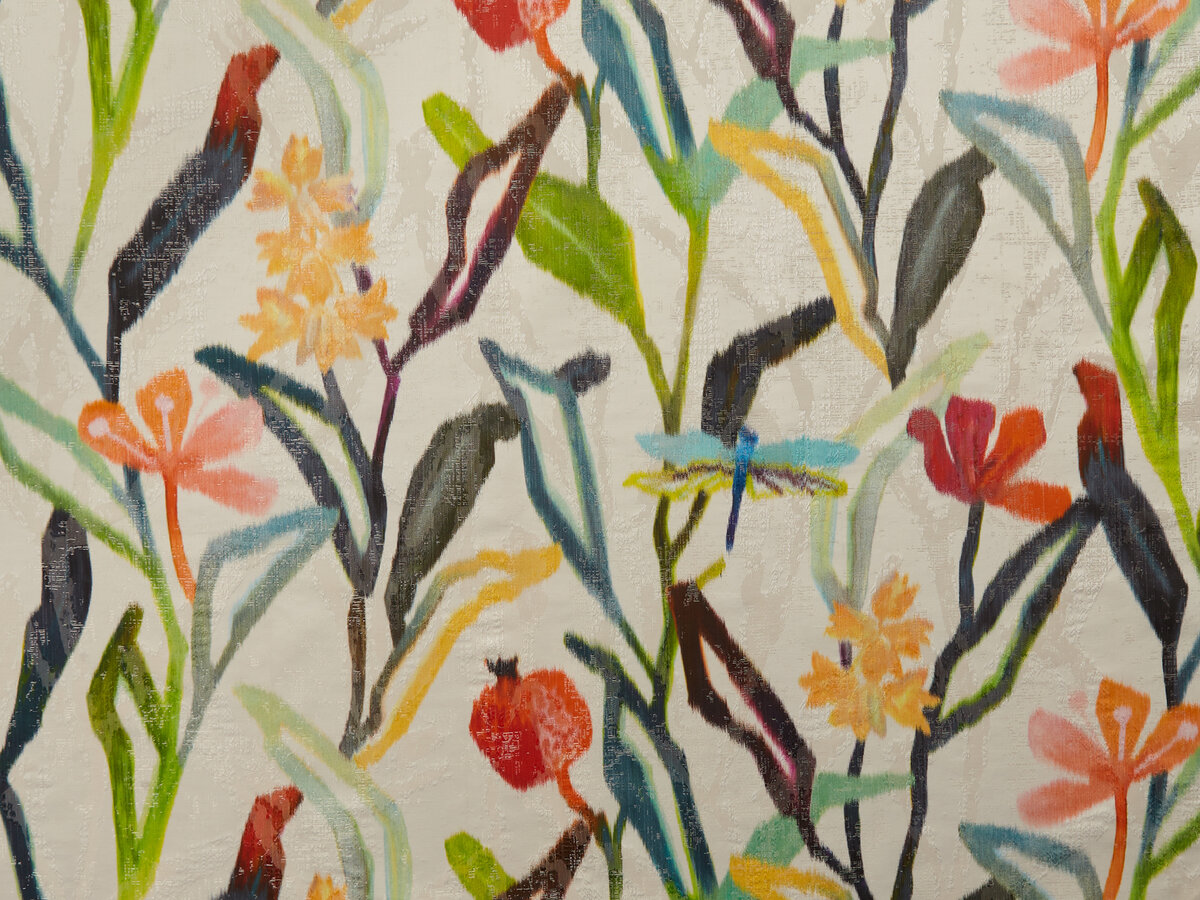 Years ago, artists such as Henri Rousseau dreamed of magical gardens in exotic lands, without themselves having ever seen them. In their paintings, they gave free rein to their imaginations. Wonderland, too, depicts a mythical landscape, where dragonflies perch on reeds and delicate blossoms nestle together. Its warp print accentuates the vibrancy of the pattern; the grass seems to be gently swaying in a balmy summer breeze.