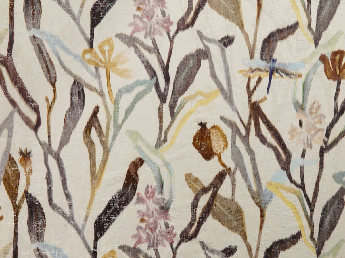 Years ago, artists such as Henri Rousseau dreamed of magical gardens in exotic lands, without themselves having ever seen them. In their paintings, they gave free rein to their imaginations. Wonderland, too, depicts a mythical landscape, where dragonflies perch on reeds and delicate blossoms nestle together. Its warp print accentuates the vibrancy of the pattern; the grass seems to be gently swaying in a balmy summer breeze.