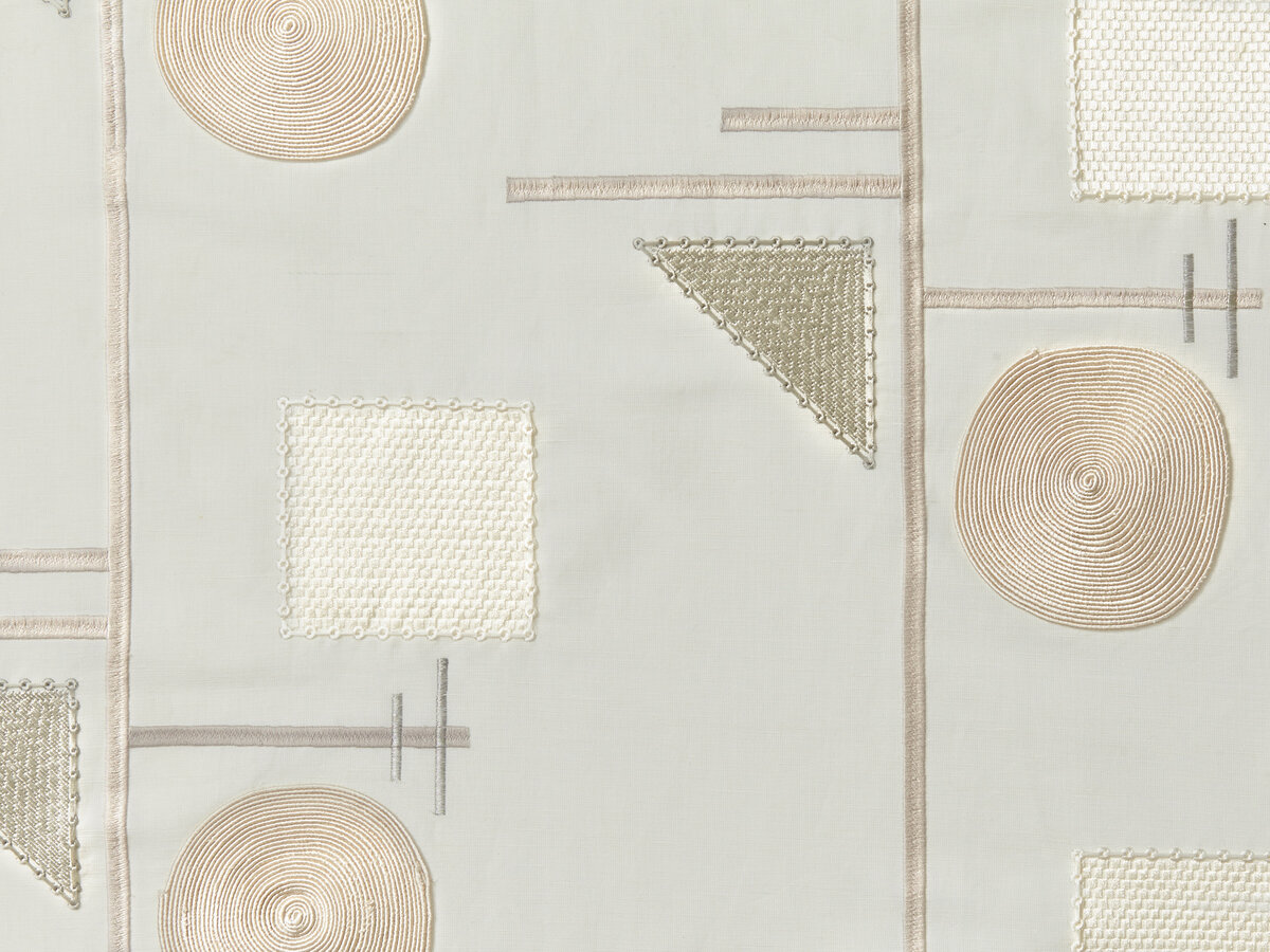 The ethnic-inspired geometry of this intricate embroidery simultaneously evokes the stylistic idiom of the Bauhaus era, for the great designers of that age also loved to take inspiration from the indigenous beauty of ancient cultures.