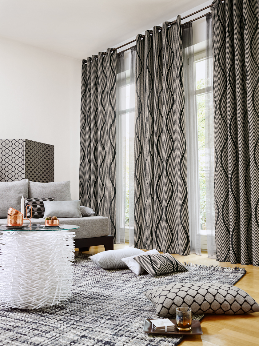 A contemporary interpretation of a herringbone pattern, interspersed with lavish wavy lines. This decorative fabric in Jacquard weave is available in nine colour combinations, from delicate pastels on a beige background through to dramatic sand on black – hues that work perfectly with the palette of the BOHEMIA range.