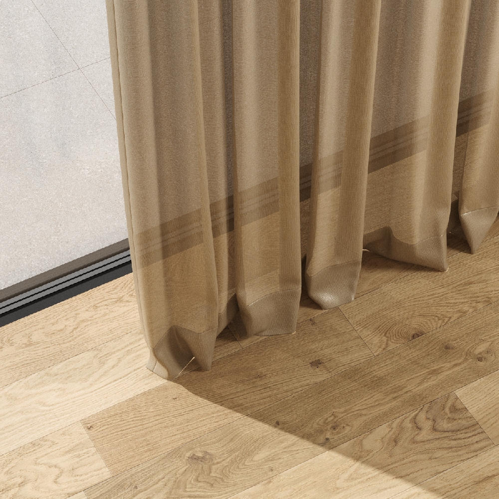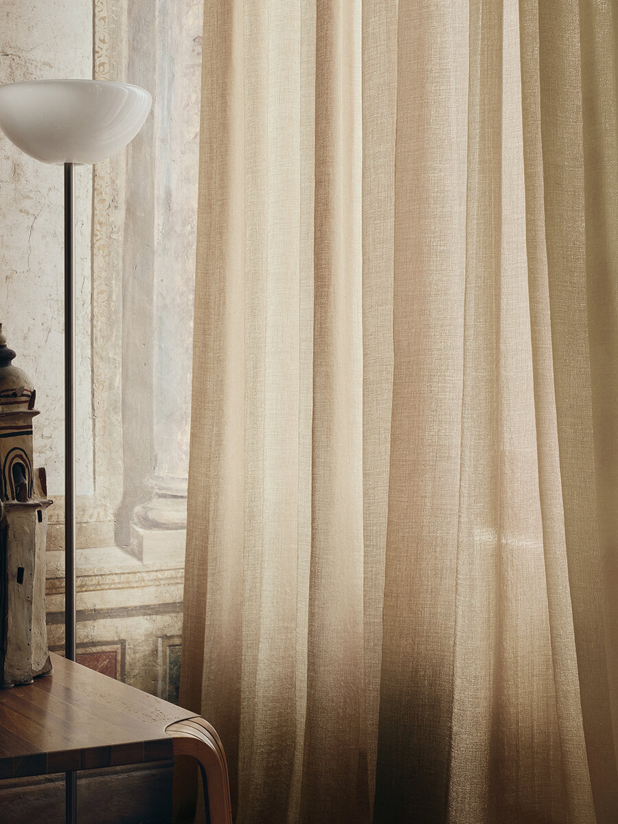 The curtain fabric ZOE RE fills any interior with carefree lightness. The front and back of the translucent double-face fabric boast different color nuances according to which yarn was used, blending against the light to create a lively multilayered watercolor-like complexity and delicacy.