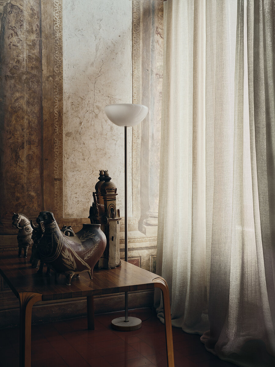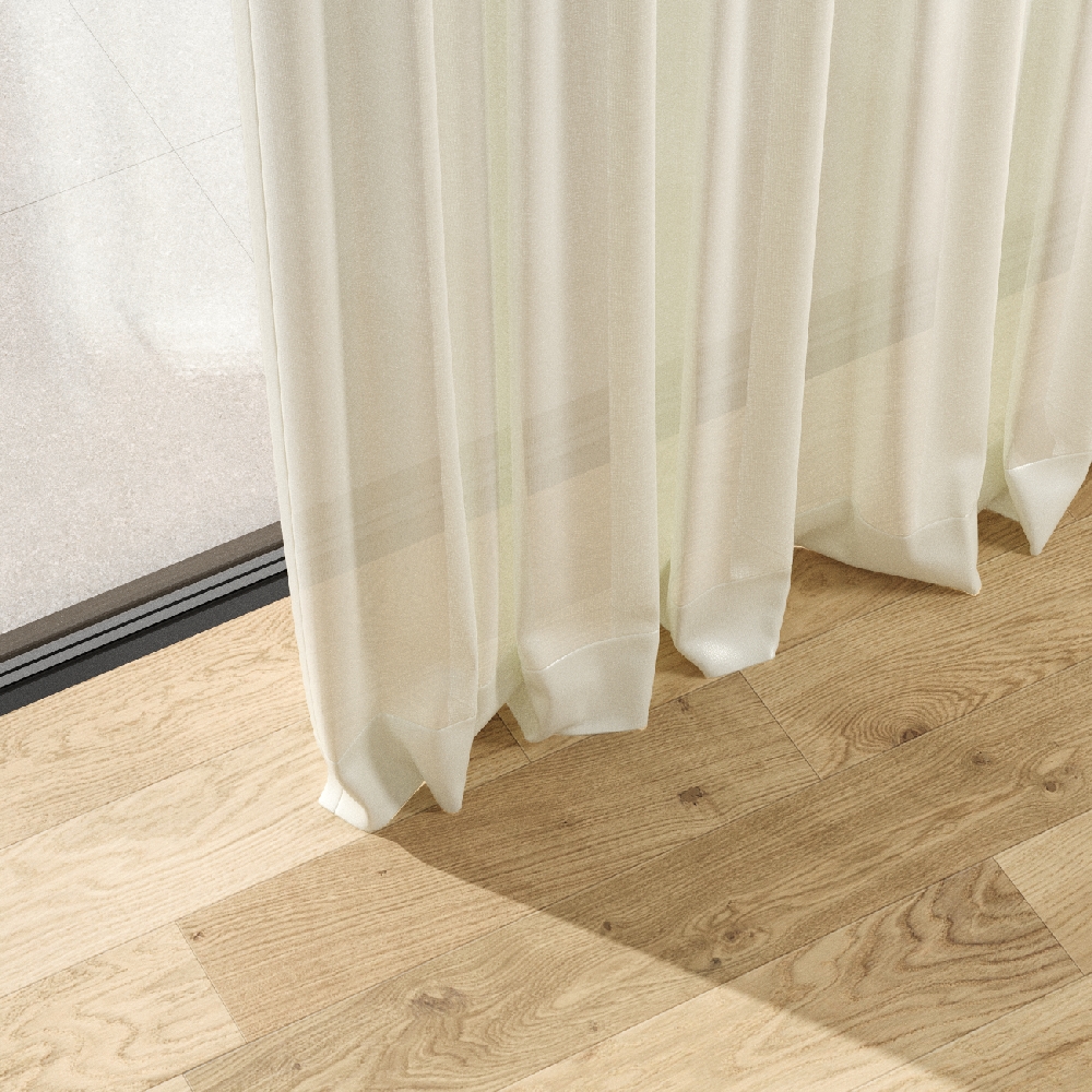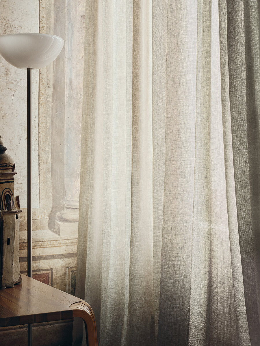 The curtain fabric ZOE RE fills any interior with carefree lightness. The front and back of the translucent double-face fabric boast different color nuances according to which yarn was used, blending against the light to create a lively multilayered watercolor-like complexity and delicacy.