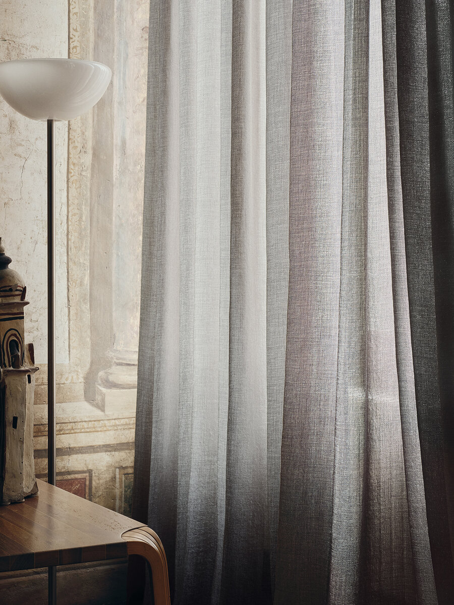 The curtain fabric ZOE RE fills any interior with carefree lightness. The front and back of the translucent double-face fabric boast different color nuances according to which yarn was used, blending against the light to create a lively multilayered watercolor-like complexity and delicacy.